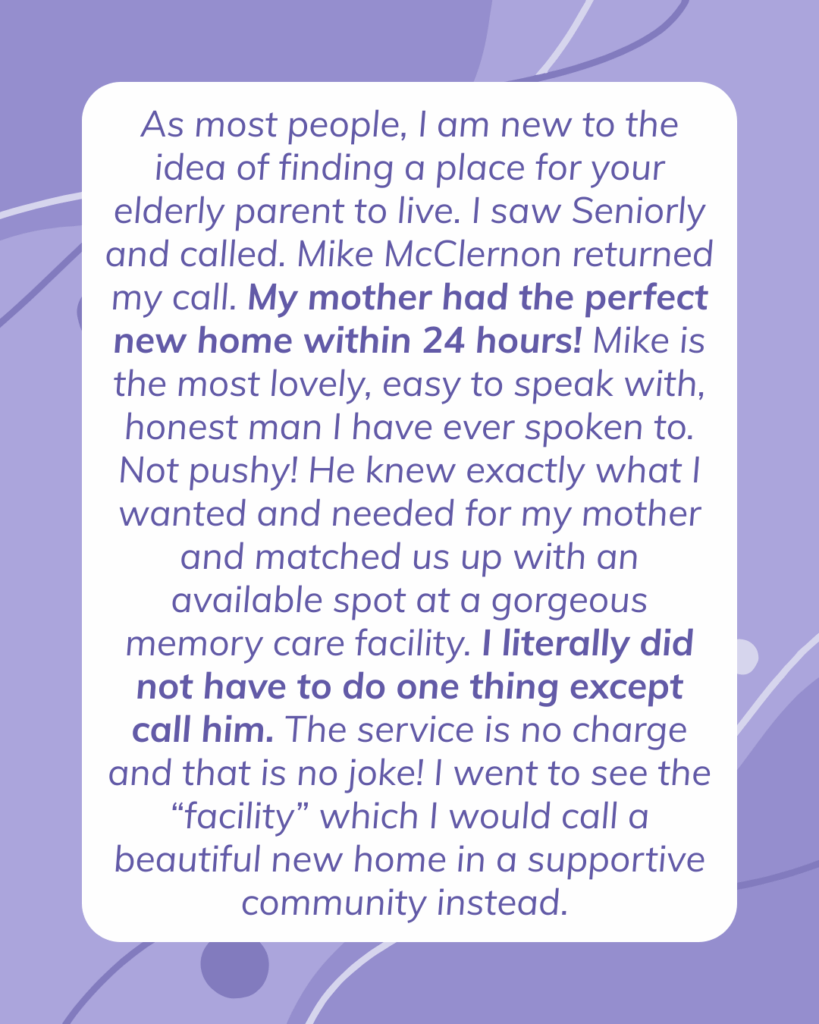 We help families find the right senior living community—whether that’s Assisted Living, Memory Care, Independent Living, or Home Care. We assess your loved one’s needs, compare options, and guide you through every step of the decision-making process. Our service is completely free for families.